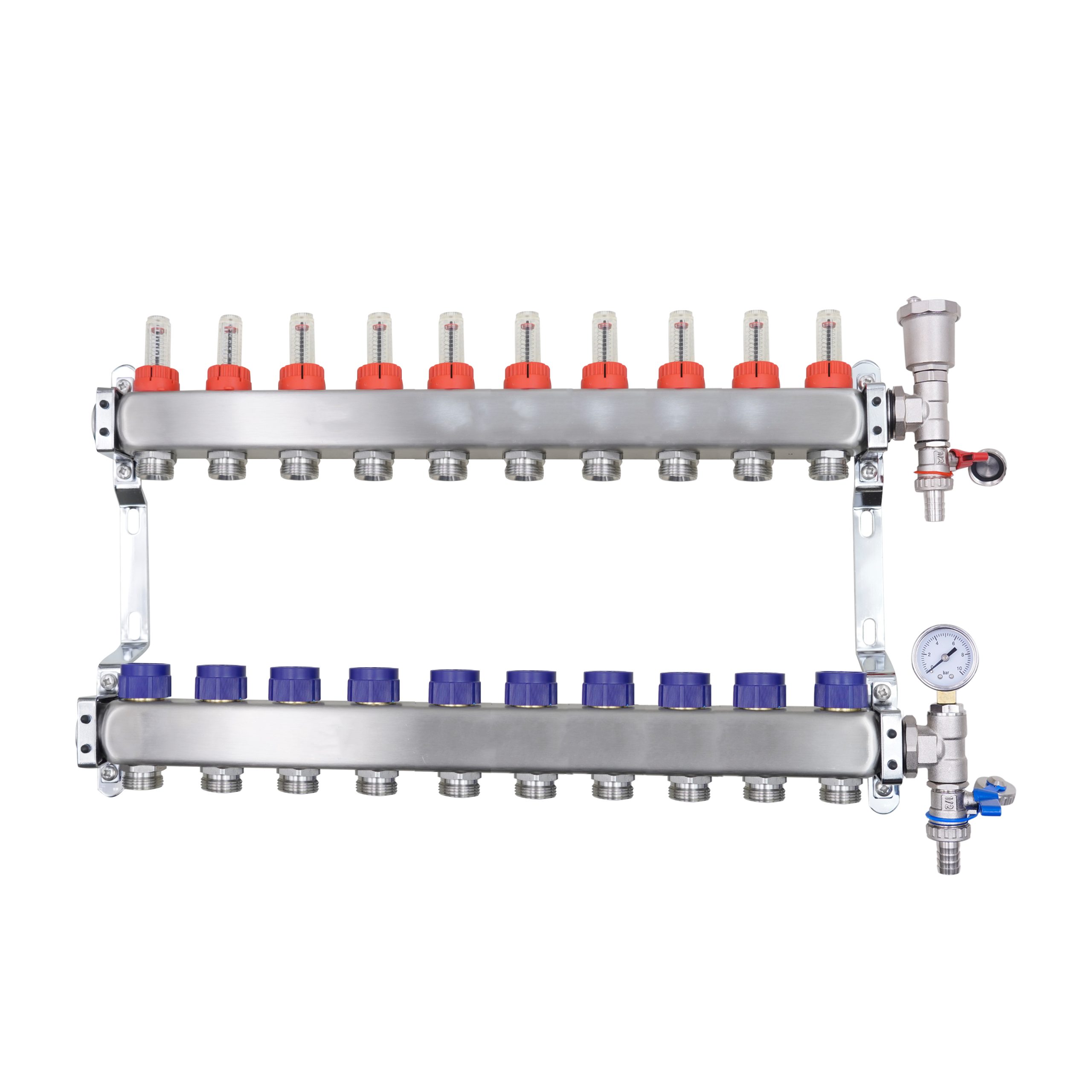 The 10 Port manifold With Pressure gauge and auto air vent is a reliable and efficient solution for underfloor heating systems. This port manifold pressure gauge and has been designed to integrate seamlessly with both modern and traditional UFH installations.