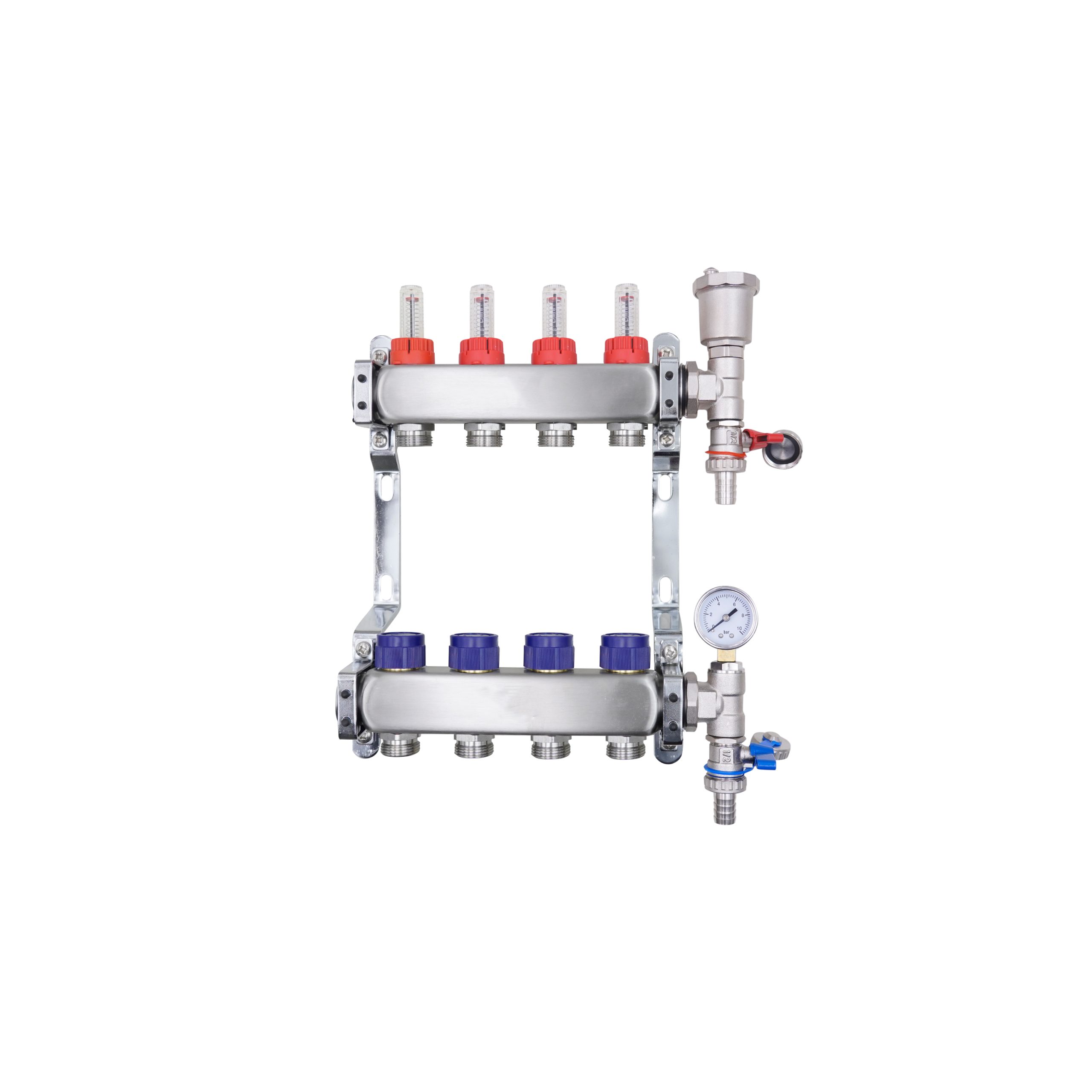 The 4 Port manifold With Pressure gauge and auto air vent is a reliable and efficient solution for underfloor heating systems. This port manifold pressure gauge and has been designed to integrate seamlessly with both modern and traditional UFH installations.